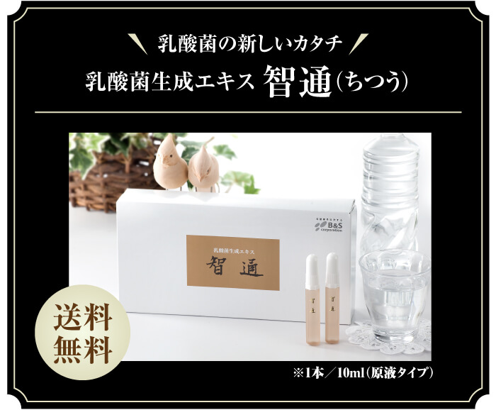 | 特徴 | 『智通』は、大正時代から研究をかさね、選びぬき、パワーアップされた16種類の乳酸菌を、農薬不使用の大豆からつくった豆乳の中で育て、熟成させ、すぐれた成分だけを取り出したエキスです。 |