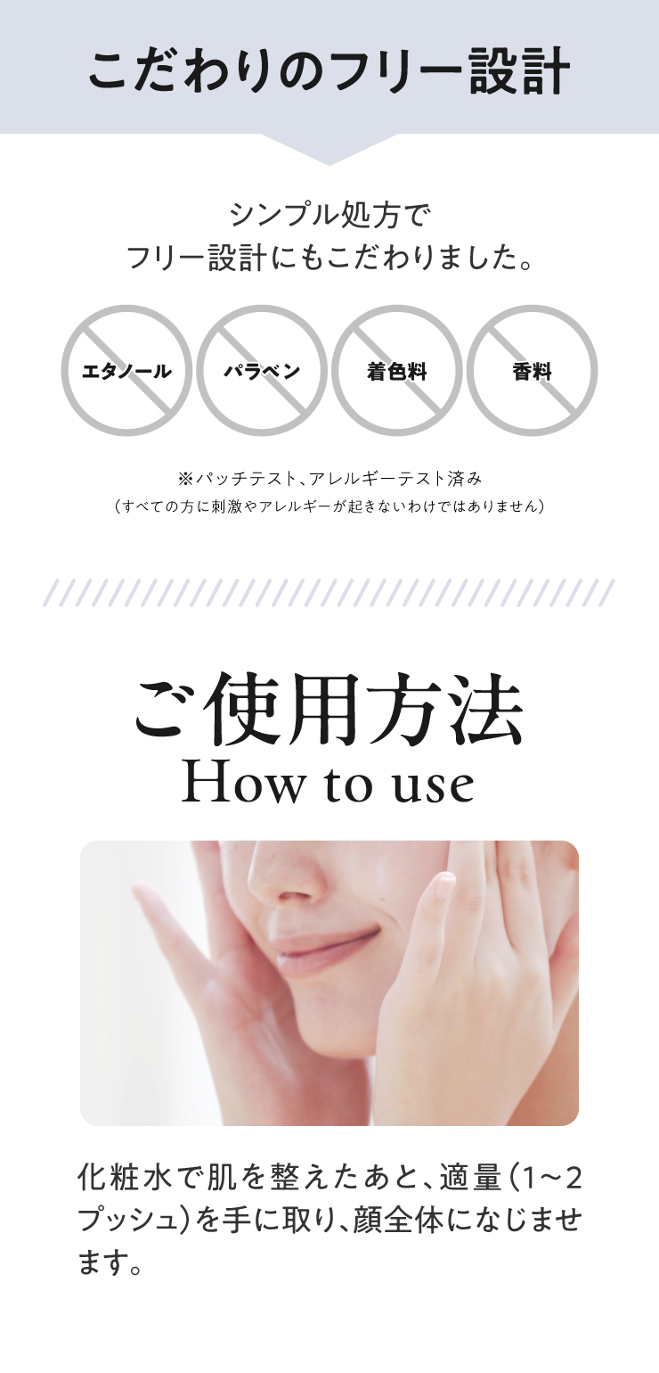 使用方法 | 化粧水で肌を整えたあと、適量(1~2プッシュ)を手にとり、顔全体になじませます。 |