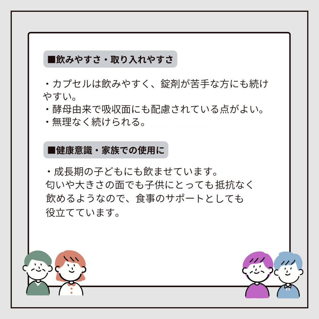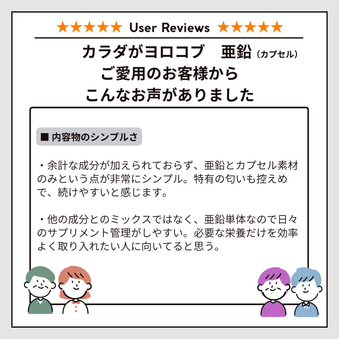 特徴 | 特製酵母ミネラルを採用 食品の精製の過程で失われがちな亜鉛を効率よく補給できます。 ※特製酵母ミネラルとは シュラウザー博士(ドイツ)が発明した、ミネラルの製造方法。 酵母を培養する過程で製造されるミネラルは、純粋な「有機ミネラル」です。 カプセルは植物性素材 使われているカプセルはプルランと呼ばれる素材です。 プルランは非遺伝子組換キャッサバ芋のでんぷんを使用したカプセルで、酸素透過性が低いため内容物を酸化から守り品質を保持します。 |