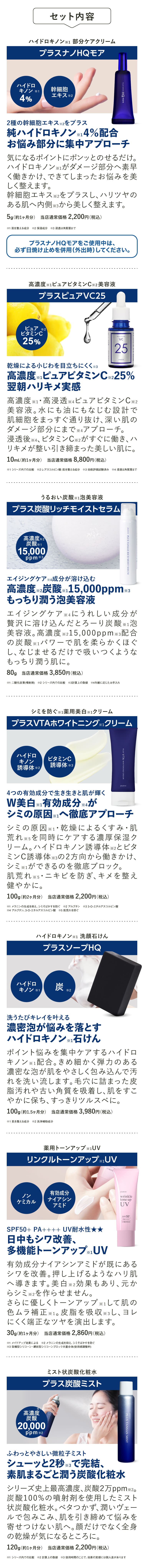 総額26,090円(税込)相当!(当店通常価格) 【 毎年人気No.1 】純ハイドロキノン(※1)4%配合のプラスナノHQモアやピュアビタミンC(※2)25%美容液、もっちり潤す炭酸(※3)美容液、シミ(※4)を防ぐ薬用美白(※4)クリーム、ミスト化粧水をはじめとした、年齢による肌悩みへ多角的にアプローチするトータルケア全7点セット♪ (※1)整肌成分 (※2)L-アスコルビン酸:整肌成分 (※3)二酸化炭素:噴射剤として (※4)メラニンの生成を抑え、シミそばかすを防ぐ |
