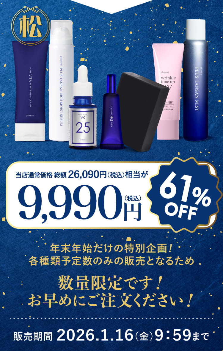 プラスキレイ福袋 2026『松』 ・プラスナノHQモア 5g ・プラスピュアVC25 10mL ・プラス炭酸リッチモイストセラム 80g ・プラスVTAホワイトニングクリーム 100g ・プラスソープHQ 100g ・リンクルトーンアップUV 30g ・プラス炭酸ミスト 120g ●商品の詳細につきましては、上記の商品名をクリックしてご確認ください。 |