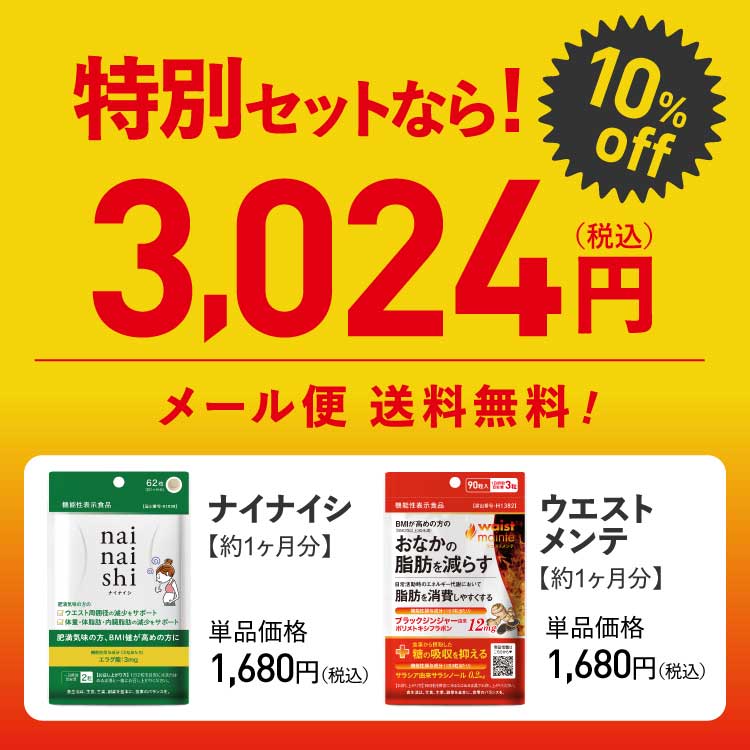 お召し上がり方 | ナイナイシ:1日2粒を目安に、水またはぬるま湯とともにお好きなタイミングでお召し上がりください。 ウエストメンテ:1日3粒を目安に、水またはぬるま湯とともにお好きなタイミングでお召し上がりください。 |