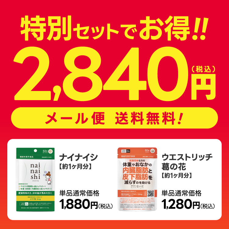 | 内容量 | ナイナイシ:21.7g(350mg×62粒)約1か月分 ウエストリッチ 葛の花:15.0g(250mg×60粒) 30日分 |