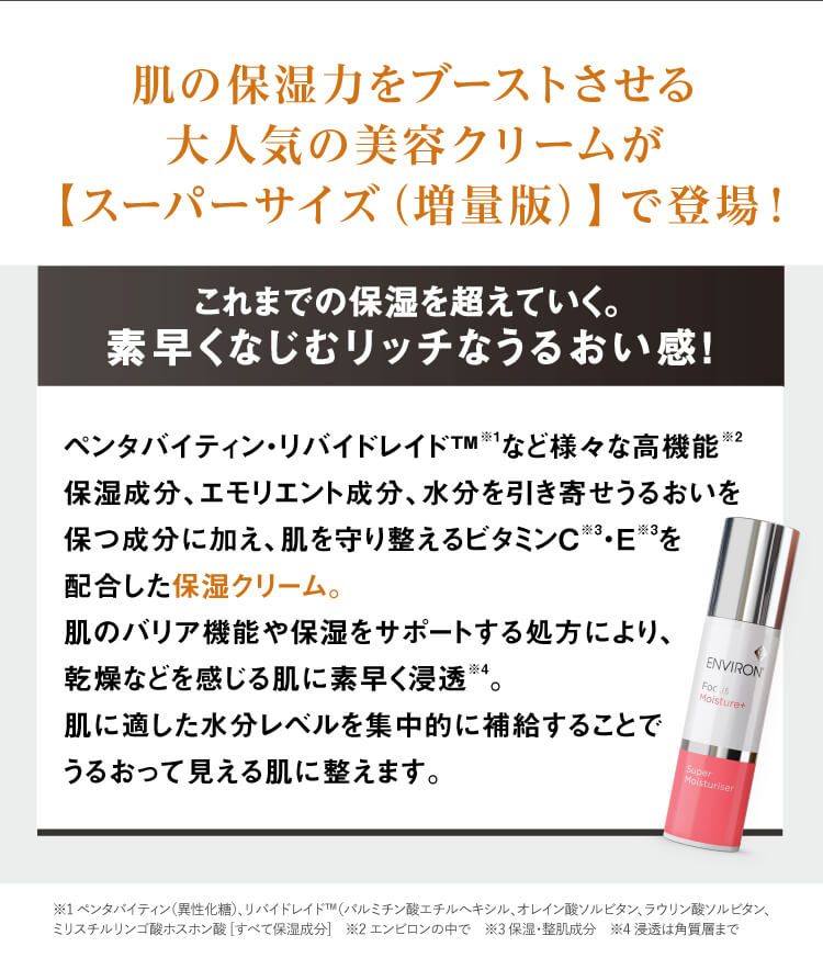 スーパーモイスチャライザーは、肌をやわらかく、なめらかに、そしてしなやかに整え、健康的な輝きを与える美容クリームです。 肌のバリア機能や保湿をサポートする処方により 乾燥などを感じる肌に素早く浸透※1、 肌に適した水分レベルを集中的に補給することで、うるおって見える肌に整えます。 様々な高機能※2保湿成分、エモリエント成分、水分を引き寄せうるおいを保つ成分に加え、肌を守り、整えるビタミンC※3、E※3を配合しています。 また、エアレスボトルを採用し、いつでも新鮮な状態のクリームをご使用いただけます。 [キー成分] -- 高機能※2保湿成分 〇ペンタバイティン®(異性化糖) ※4 〇リバイドレイド™ (パルミチン酸エチルヘキシル、オレイン酸ソルビタン、ラウリン酸ソルビタン、ミリスチルリンゴ酸ホスホン酸)※4 -- 水分を引き寄せうるおいを保つ成分 〇グリセリン※4 〇スクワラン※4 〇プロビタミンB5 (パンテノール) ※3 -- エモリエント成分 〇シア脂※4 〇ホホバ種子油※4 〇ラノリン※4 -- 外的ストレス※5からのディフェンス成分 〇ビタミンC (テトラヘキシルデカン酸アスコルビル) ※3 〇ビタミンE (酢酸トコフェロール、トコフェロール) ※3 【このような方におすすめです】 ●乾燥肌、うるおい不足を感じている方 ●バリア機能が低下したゆらぎ肌の方(敏感肌)※6 ●エイジングサインが気になる方 ●トリートメント後や美容医療施術後のアフターケア期間の保湿ケア ●一時的なレチノイド反応(ビタミンA※7反応)が起きた時の保湿サポートとして ※1 浸透は角質層まで ※2 エンビロンの中で ※3 保湿・整肌成分 ※4 保湿成分 ※5 乾燥による ※6 すべての方に、肌トラブルや刺激が起こらないわけではありません ※7 整肌成分 |