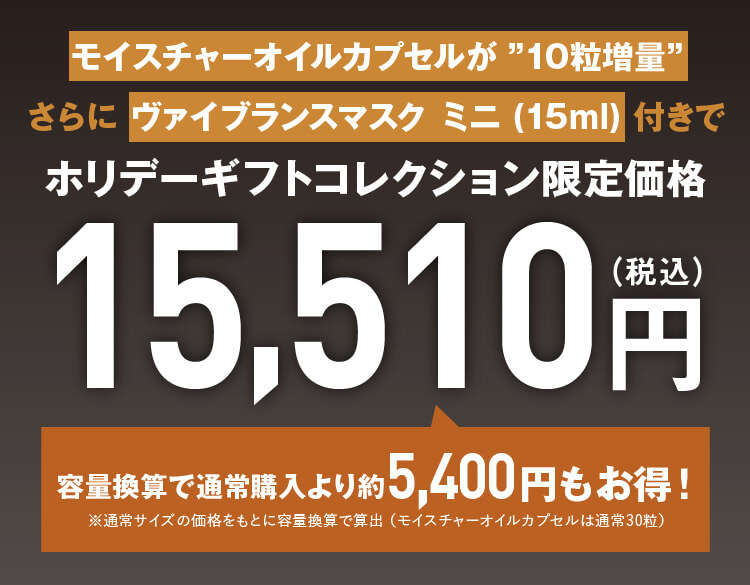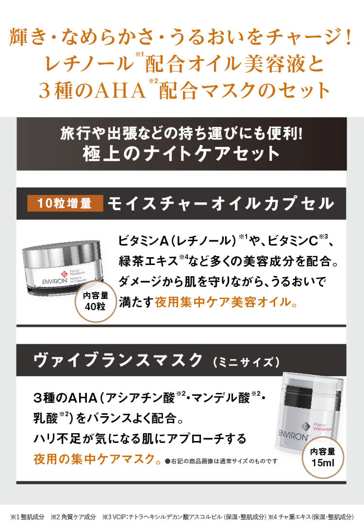 「10粒増量」されたモイスチャーオイルカプセルに「ヴァイブランスマスク ミニ」がセットでついてくる、数量限定のお得な商品です! ■モイスチャーオイルカプセル うるおって輝く肌へ導くカプセル状美容オイル。 ビタミンA(レチノール)※1やビタミンC(VCIP:テトラヘキシルデカン酸アスコルビル)※2、緑茶エキス※2、ローズマリーエキス※2など 多くの美容成分を閉じ込めた夜用集中ケア美容オイル。 ダメージから肌を守りながら、うるおいを与えます。さらっと肌なじみがよく、シルクのようにつややかないきいきとした肌へ導きます。 ※香料・着色料は使用しておりません [キー成分] 〇ビタミンA(レチノール)※1 〇ビタミンC(VCIP:テトラヘキシルデカン酸アスコルビル)※2 〇緑茶エキス(チャ葉エキス)※2、ローズマリー葉エキス※2、リポクロマン(ジメチルメトキシクロマノール)※2 〇シトステロール ※2 〇ダイズ油 ※2 【このような方におすすめです】 ●乾燥が気になる方 ●やわらかくうるおいのある肌を求める方 ●集中保湿アイテムをお探しの方 ●ハリ・ツヤのある肌を求める方 ※1 整肌成分 ※2 保湿・整肌成分 ■ヴァイブランスマスク いきいきとした若々しい印象のハリとなめらかさを与える夜用の集中ケアマスク。 ハリ不足が気になる肌のために3種類のAHA(アシアチン酸※1、マンデル酸※1、乳酸※1)を配合しています。 アシアチン酸※1は、ハリ・うるおいを与え、マンデル酸※1は肌印象を明るくクリア※2に、乳酸※1は肌をなめらかに整えます。 [キー成分] 〇AHA (アシアチン酸※1、マンデル酸※1、乳酸※1) 【このような方におすすめです】 ●ハリや弾力が気になる方 ●肌をなめらかで均一に整えたい方 ●夜用ケアマスクをお探しの方 ※1 角質ケア成分 ※2 うるおいによる |