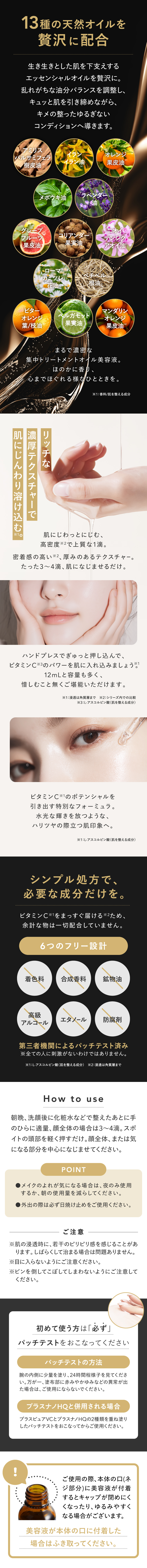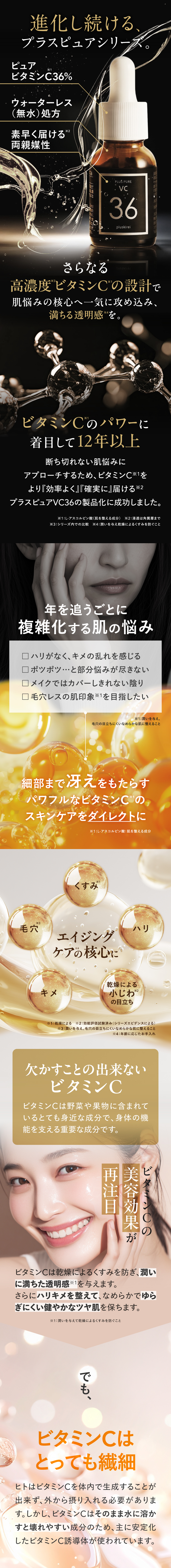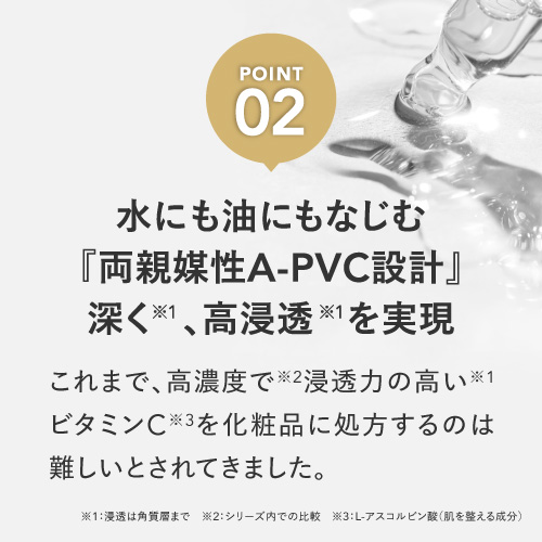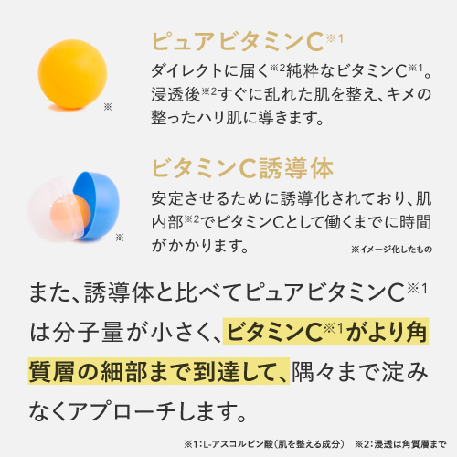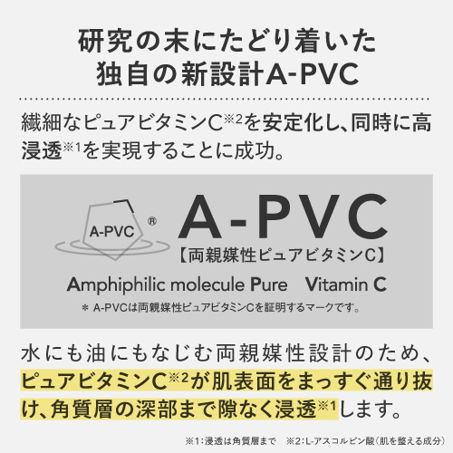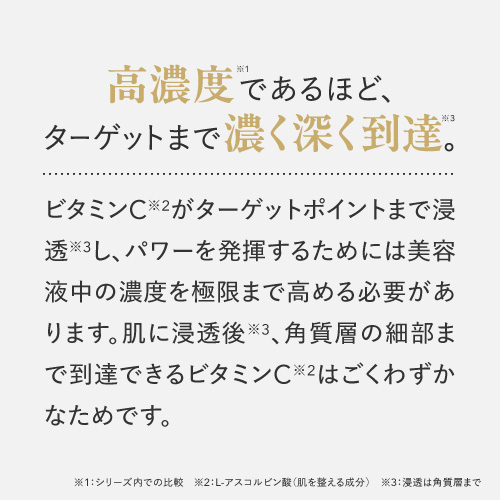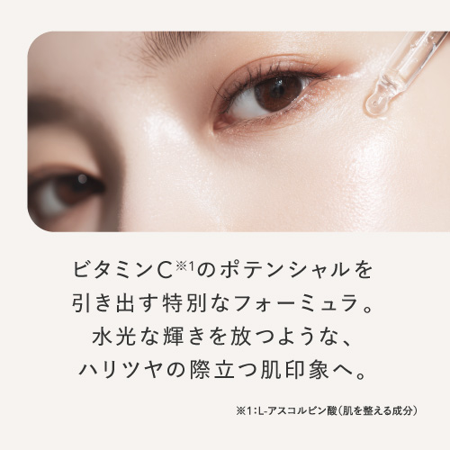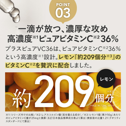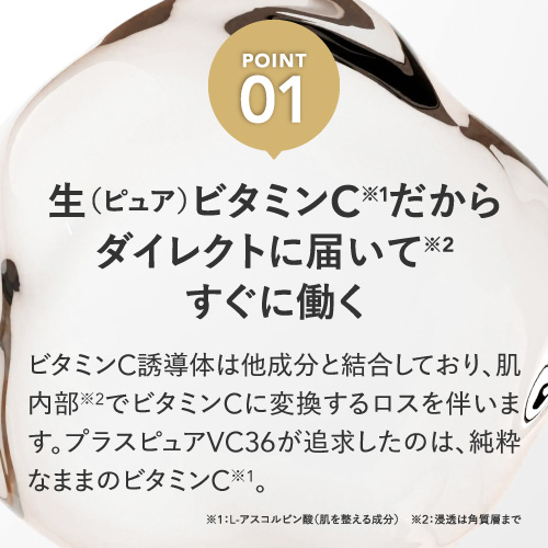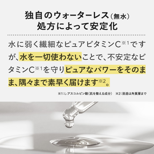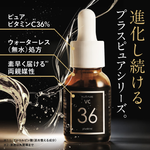 | 特徴 | プラスキレイ史上最高濃度の圧倒的パワー。ピュアビタミンC(*1)36%美容液。 さらなる高濃度(*2)ビタミンC(*1)の設計で肌悩みの核心へ一気に攻め込み、満ちる透明感(*3)に。 ■パワフルに働くビタミンC(*1) 乾燥によるくすみを防ぎ、潤いに満ちた透明感(*3)を与えます。 さらにハリキメを整えて、なめらかでゆらぎにくい健やかなツヤ肌を保ちます。 <エイジングケア(*4)の核心に> くすみ(*3)/ハリ/キメ/毛穴(*5)/乾燥による小じわ(*6)の目立ち ■ダイレクトに届く(*7)ピュアビタミンC(*1) 独自のウォーターレス(無水)処方によって、不安定なビタミンC(*1)を安定化。 浸透後(*7)すぐに乱れた肌を整え、キメの整ったハリ肌に導きます。 ビタミンC誘導体と比べてピュアビタミンC(*1)は分子量が小さく、ビタミンC(*1)がより角質層の細部まで到達します。 ■『両親媒性A-PVC設計』で高浸透(*7)を実現 水にも油にもなじむ両親媒性設計により、ピュアビタミンC(*1)が肌表面をまっすぐ通り抜け、角質層まで隙なく浸透(*7)します。 ■高濃度(*2)ピュアビタミンC(*1)36% レモン『約209個分(*8)』のビタミンC(*1)を贅沢に配合。 角質層の細部まで到達できるビタミンC(*1)はごくわずかなため、高濃度(*2)であるほど、よりビタミンC(*1)がパワーを発揮します。 13種の天然オイル(*9)を贅沢に配合。肌にじわっとにじむ、高密度(*2)で上質な1滴。密着感の高い(*2)、厚みのあるテクスチャーです。 (*1)L-アスコルビン酸:肌を整える成分 (*2)シリーズ内での比較 (*3)潤いを与え乾燥によるくすみを防ぐこと (*4)年齢に応じたお手入れ (*5)潤いを与え、毛穴の目立ちにくいなめらかな肌に整えること (*6)効能評価試験済み:シリーズエビデンスによる (*7)浸透は角質層まで (*8)レモン1個(果汁50g)あたりのピュアビタミンCが25mgと換算:五訂日本食品標準成分表より算出 (*9)香料/肌を整える成分 |