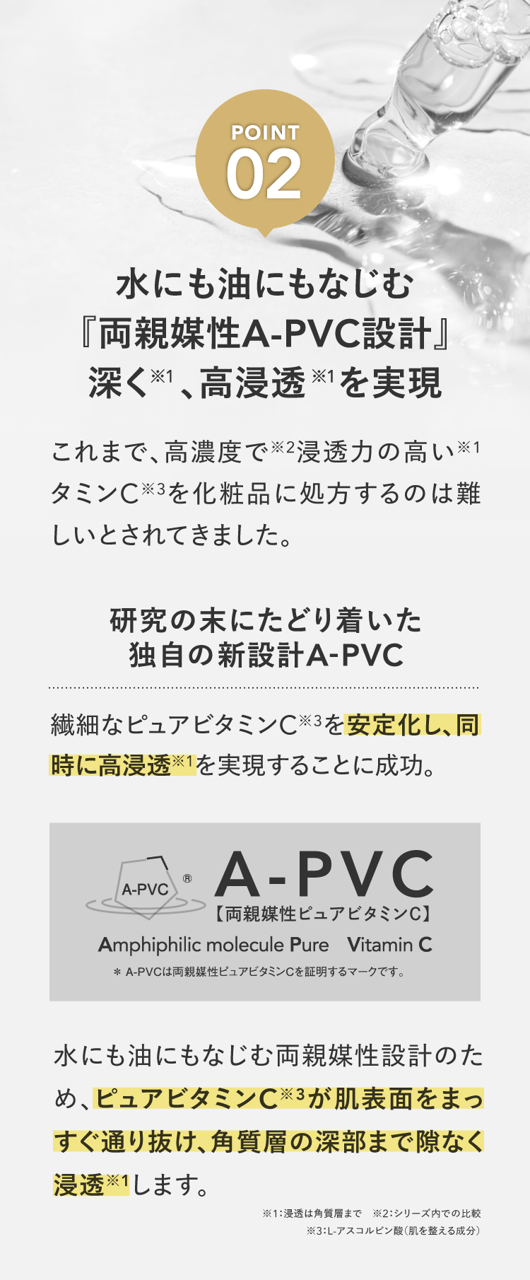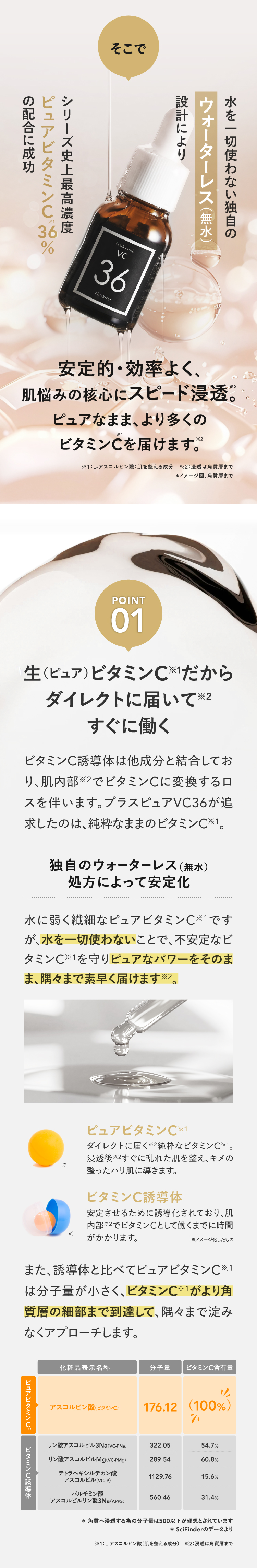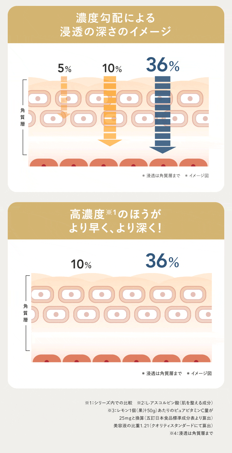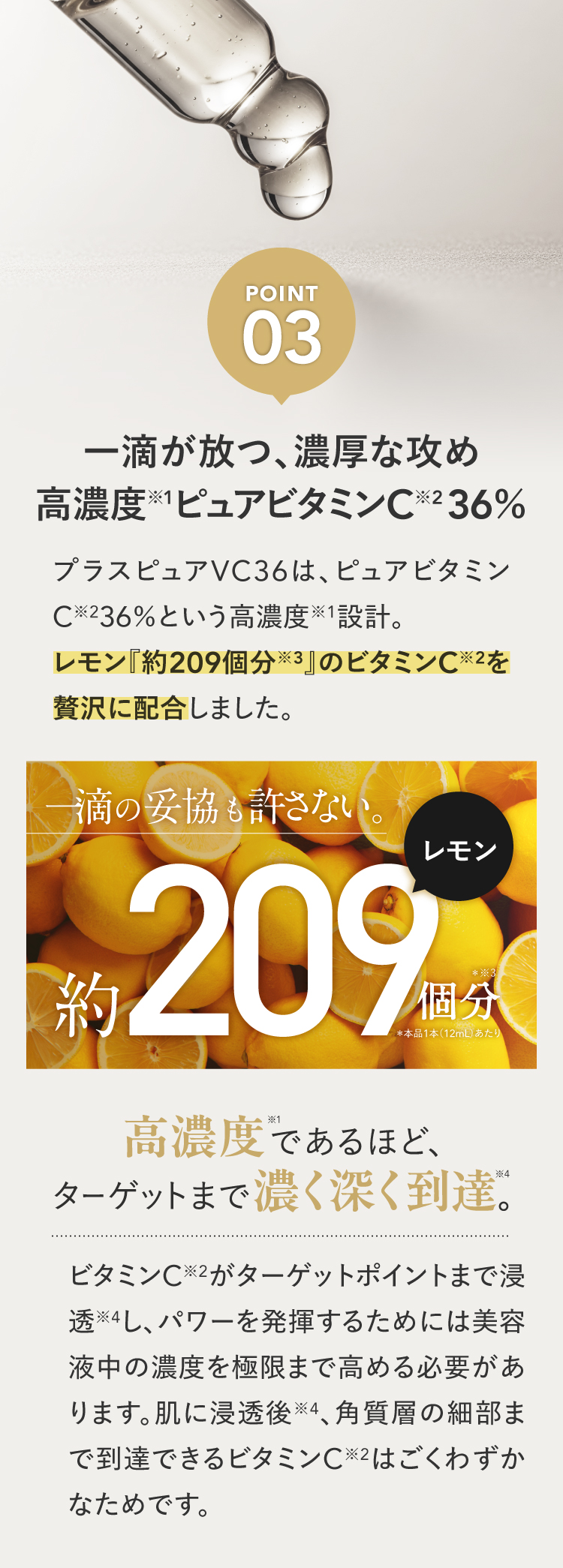 | 特徴 | プラスキレイ史上最高濃度の圧倒的パワー。ピュアビタミンC(*1)36%美容液。 さらなる高濃度(*2)ビタミンC(*1)の設計で肌悩みの核心へ一気に攻め込み、満ちる透明感(*3)に。 ■パワフルに働くビタミンC(*1) 乾燥によるくすみを防ぎ、潤いに満ちた透明感(*3)を与えます。 さらにハリキメを整えて、なめらかでゆらぎにくい健やかなツヤ肌を保ちます。 <エイジングケア(*4)の核心に> くすみ(*3)/ハリ/キメ/毛穴(*5)/乾燥による小じわ(*6)の目立ち ■ダイレクトに届く(*7)ピュアビタミンC(*1) 独自のウォーターレス(無水)処方によって、不安定なビタミンC(*1)を安定化。 浸透後(*7)すぐに乱れた肌を整え、キメの整ったハリ肌に導きます。 ビタミンC誘導体と比べてピュアビタミンC(*1)は分子量が小さく、ビタミンC(*1)がより角質層の細部まで到達します。 ■『両親媒性A-PVC設計』で高浸透(*7)を実現 水にも油にもなじむ両親媒性設計により、ピュアビタミンC(*1)が肌表面をまっすぐ通り抜け、角質層まで隙なく浸透(*7)します。 ■高濃度(*2)ピュアビタミンC(*1)36% レモン『約209個分(*8)』のビタミンC(*1)を贅沢に配合。 角質層の細部まで到達できるビタミンC(*1)はごくわずかなため、高濃度(*2)であるほど、よりビタミンC(*1)がパワーを発揮します。 13種の天然オイル(*9)を贅沢に配合。肌にじわっとにじむ、高密度(*2)で上質な1滴。密着感の高い(*2)、厚みのあるテクスチャーです。 (*1)L-アスコルビン酸:肌を整える成分 (*2)シリーズ内での比較 (*3)潤いを与え乾燥によるくすみを防ぐこと (*4)年齢に応じたお手入れ (*5)潤いを与え、毛穴の目立ちにくいなめらかな肌に整えること (*6)効能評価試験済み:シリーズエビデンスによる (*7)浸透は角質層まで (*8)レモン1個(果汁50g)あたりのピュアビタミンCが25mgと換算:五訂日本食品標準成分表より算出 (*9)香料/肌を整える成分 |