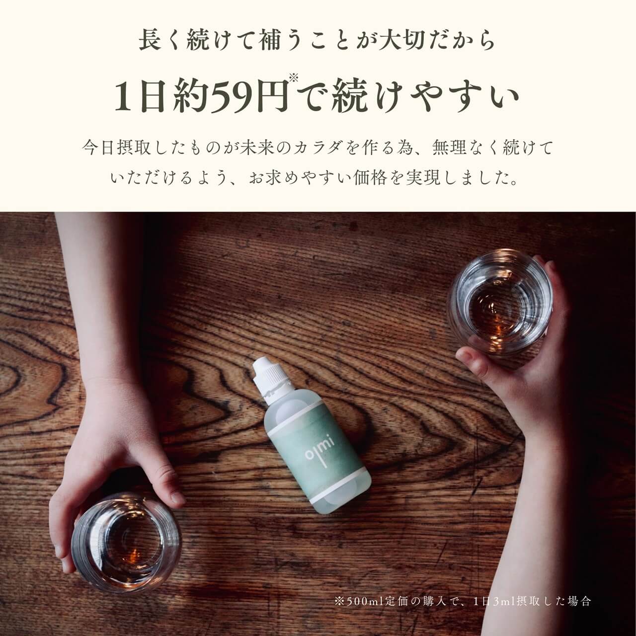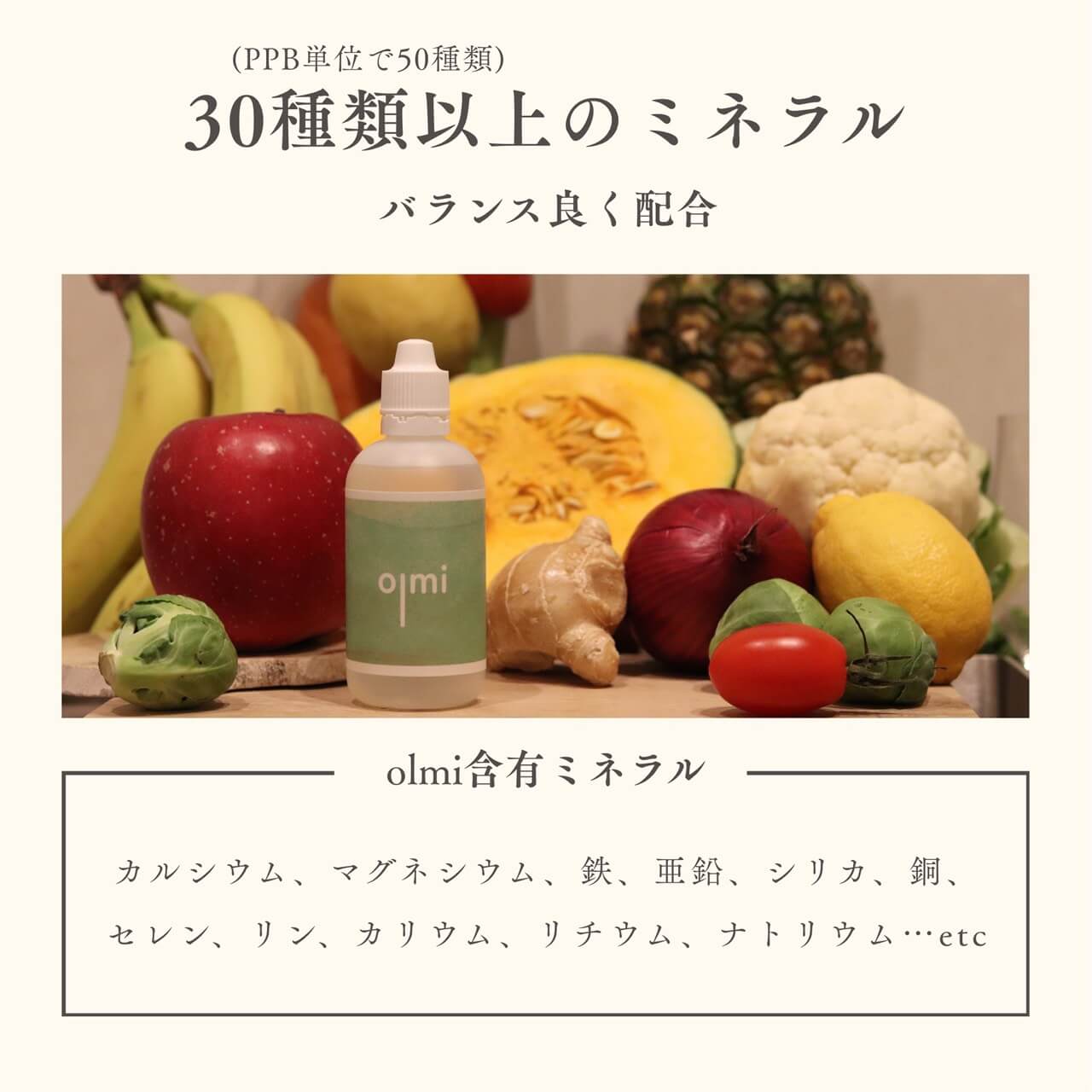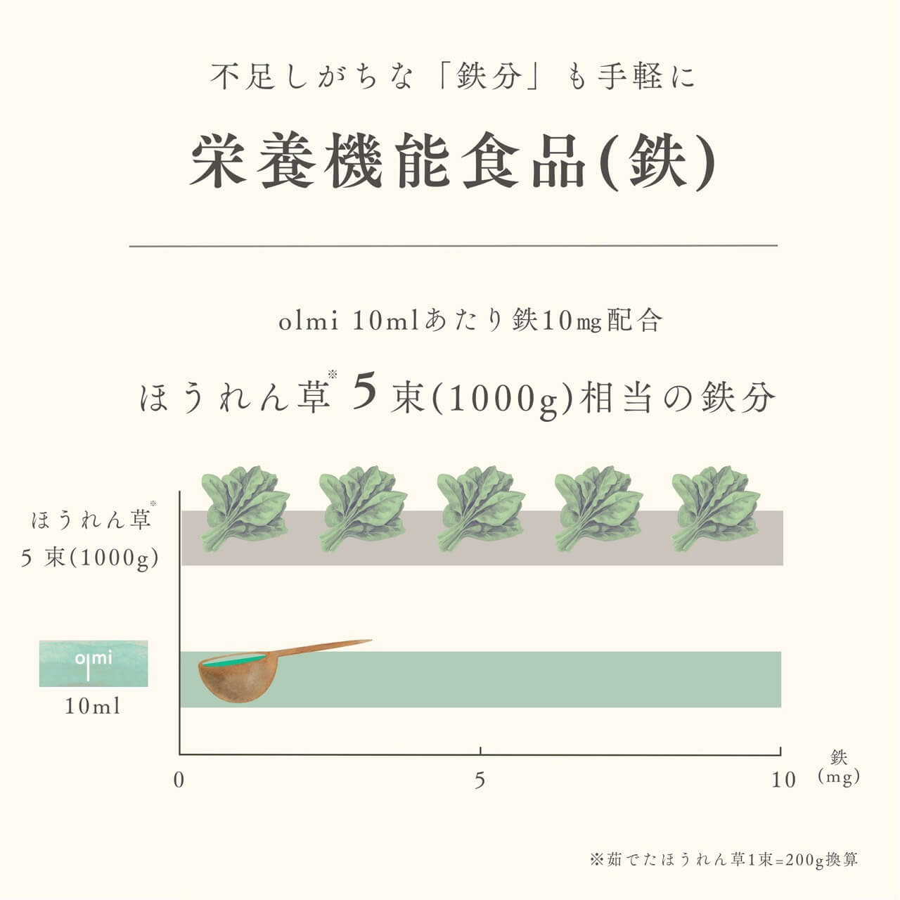 | 特徴 | イオン化ミネラル イオン化ミネラルは、初めから吸収されやすい形のため、 分解の手間が少なくスムーズに吸収されます。 30種類以上のイオン化ミネラル(PPB単位で50種類) バランスよく配合されたミネラルが健康をサポート。 栄養機能食品(鉄) 鉄は、赤血球を作るのに必要な栄養素です。 olmi 10mlあたり鉄10mg配合。 ほうれん草5束(1,000g)相当の鉄分。 国内原料・国内製造 小さなお子様でもお召し上がりいただけるよう、保存料などを使用せず、純粋なミネラルだけを詰め込みました。 原料選びから製造まで国内で行い、高い基準の衛生管理のもとで加工しております。 何にでも使える手軽さ 飲み物、汁もの、炒め物など食事のシーンから野菜の洗浄まで幅広く使用できます。(加熱してもOK) コストパフォーマンス 1日約59円 今日摂取したものが未来のカラダを作る為、無理なく続けていただけるよう、お求めやすい価格を実現しました。 ※500ml定価の購入で、1日3ml摂取した場合 |