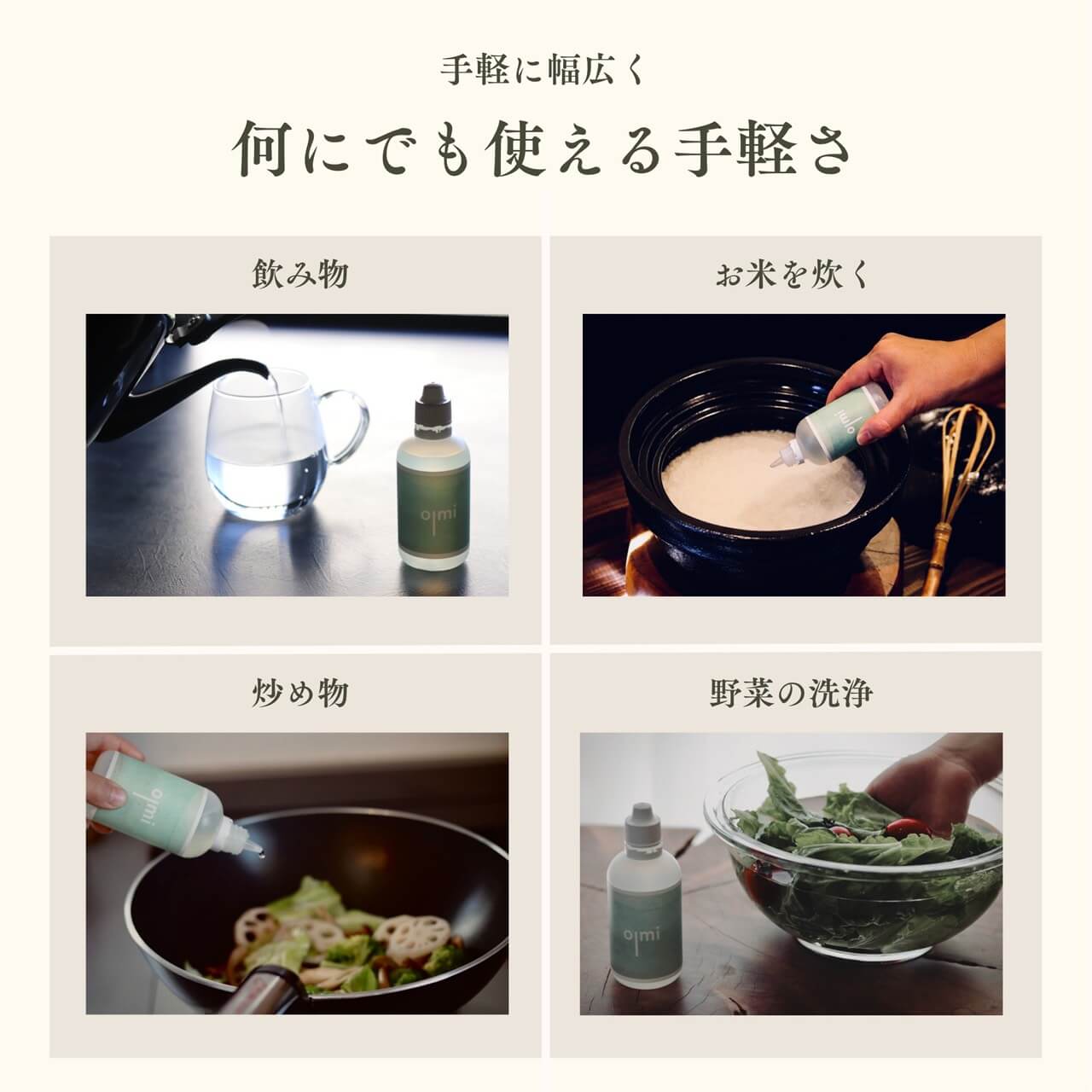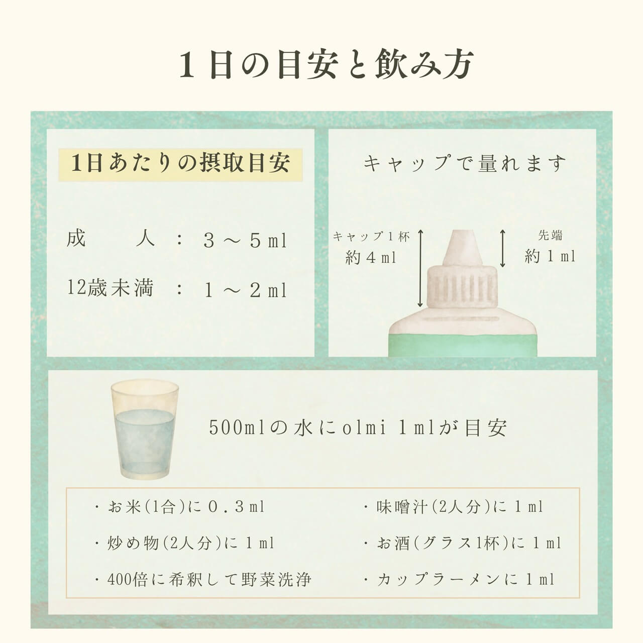 | お召し上がり方 | 1日あたり、成人3ml~5ml、12歳未満の子供1ml~2mlを水で50倍以上を目安に希釈してすぐにお飲みください。(キャップ1杯約4ml、先端約1ml) 500mlの水にolmi 1mlが目安 ・お米(1合)に0.3ml ・味噌汁(2人分)に1ml ・炒め物(2人分)に1ml ・お酒(グラスに1杯)に1ml ・400倍に希釈して野菜洗浄 ・カップラーメンに1ml |