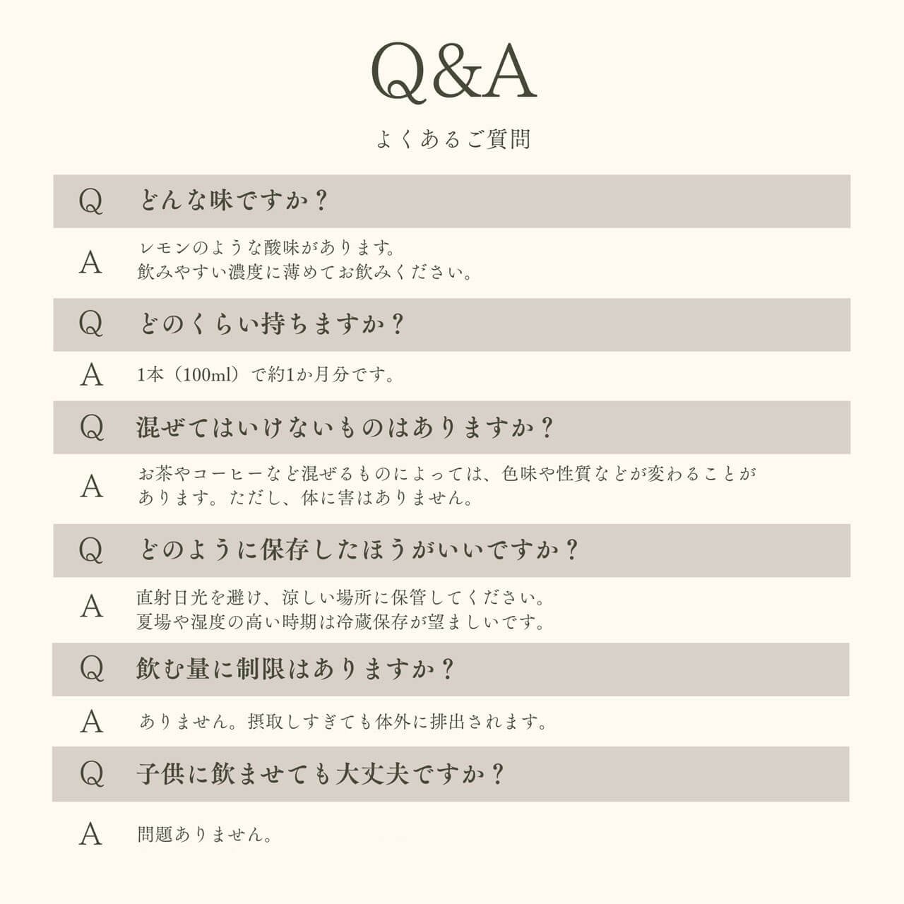 | 取り扱い方法、及び摂取する上での注意事項 | ●本品は、特定保健用食品と異なり、消費者庁長官により個別審査を受けたものではありません。 ●ミネラル成分の結晶により、浮遊・沈殿物ができる場合がありますが、品質に問題ありません。 ●本品は、酸味の強い飲料である為、原液又は原液に近い高濃度で摂取する事で、喉の粘膜を直接刺激して炎症や損傷を引き起こす可能性があります。 ●本品は、多量摂取により疾病が治癒したり、より健康が増進するものではありません。1日の摂取目安量を守ってください。 ●食生活は、主食、主菜、副菜を基本に、食事のバランスを。 |