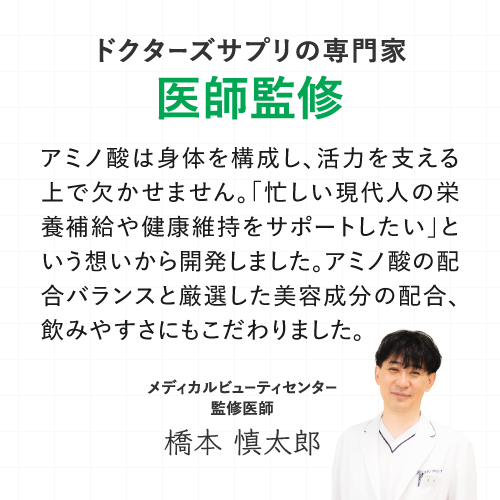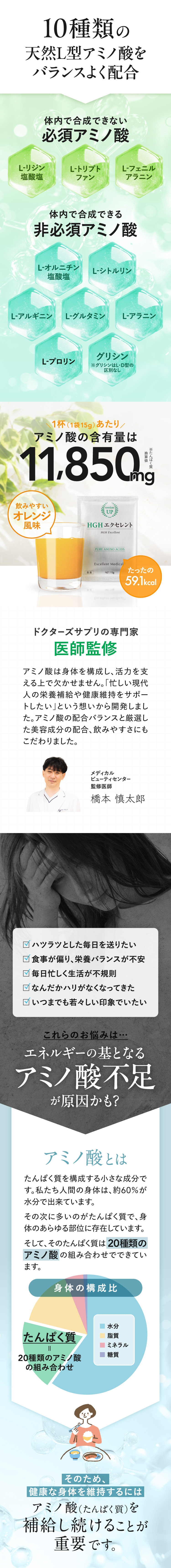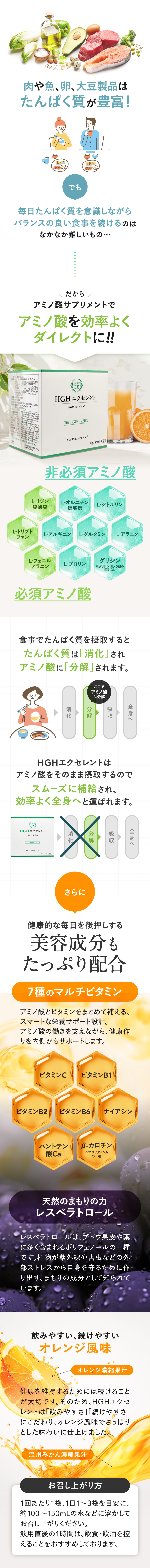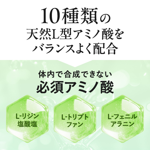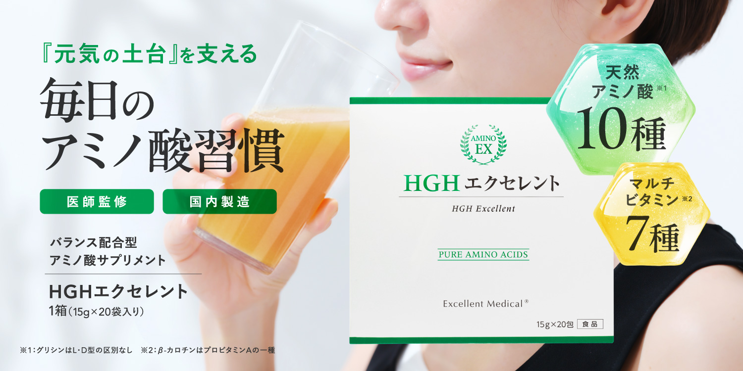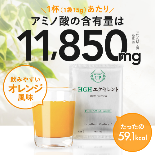 | 商品特徴 | 10種類の天然『L』型-アミノ酸(*1)をバランスよく配合した、粉末タイプのアミノ酸サプリメントです。 [ グリシン(*1)、アルギニン、リジン、グルタミン、オルニチン、フェニルアラニン、トリプトファン、シトルリン、アラニン、プロリン ] 配合。 「アミノ酸」は元気な体を保つために必要不可欠な栄養素です。 私たち人間の体は、約60~70%が水分でできていますが、その水分を除いた約3分の1がたんぱく質でできています。 筋肉や臓器、髪の毛など体のあらゆる部位にたんぱく質は存在しています。 そのたんぱく質を構成しているのが20種類の「アミノ酸」です。 たんぱく質は20種類の「アミノ酸」の組み合わせでできています。 健康な体を維持するためには、「アミノ酸(たんぱく質)」を補給し続けることが重要です。 アミノ酸の役割は種類によって異なります。 なので、アミノ酸1種類だけをたくさん摂るよりもバランスよく摂ることが何よりも重要です。 HGHエクセレントは、10種類の天然『L』型-アミノ酸(*1)をバランスよく配合しています。 アミノ酸の含有量は1杯(1袋15gあたり)で、なんと11,850mg(*2)! さらに美容と健康に関わる注目の成分「レスベラトロール」も配合。 レスベラトロールはブドウの果皮、新芽などに含まれるポリフェノールの一種です。 ポリフェノールは、紫外線や害虫などの外部ストレスから自らを守るために生物自身が作り出す、まもりの成分です。 「美味しく」「飲みやすく」「続けやすい」を求めて、オレンジ風味に仕上げました。 美容と健康を維持するためには続けることが大切です。 信頼の医師監修、安心の国内製造。 バランス配合型アミノ酸サプリメント『HGHエクセレント』で、これから先も元気で健康的な毎日を。 (*1)グリシンはL・D型の区別なし (*2)たんぱく質換算値 |