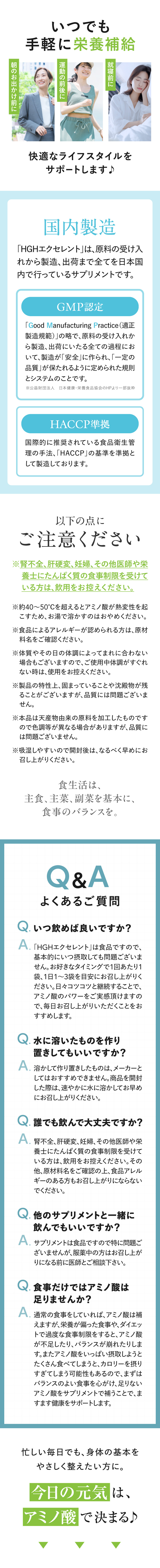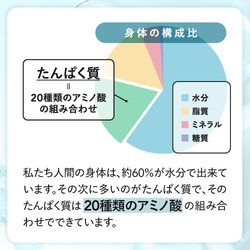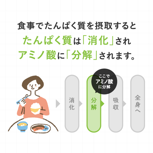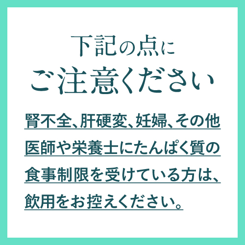 | ご使用上の注意 | ●腎不全、肝硬変、妊婦、その他医師や栄養士にたんぱく質の食事制限を受けている方は、飲用をお控えください。 ●原材料名(ここをクリックし)をご確認のうえ、食物アレルギーのある方はお召し上がりにならないでください。 ●体質やその日の体調によってまれに合わない場合もございますので、ご使用中体調がすぐれない時は、使用をお控えください。 ●約40~50℃を超えるとアミノ酸が熱変性を起こすため、お湯で溶かすのはおやめください。 ●製品の特性上、固まっていることや沈殿物が残ることがございますが、品質には問題ございません。 ●本品は天産物由来の原料を加工したものですので色調等が異なる場合がありますが、品質には問題ございません。 ●吸湿しやすいので開封後は、なるべく早めにお召し上がりください。 ●乳幼児の手の届かない場所に保存してください。 ●食生活は、主食、主菜、副菜を基本に、食事のバランスを。 |