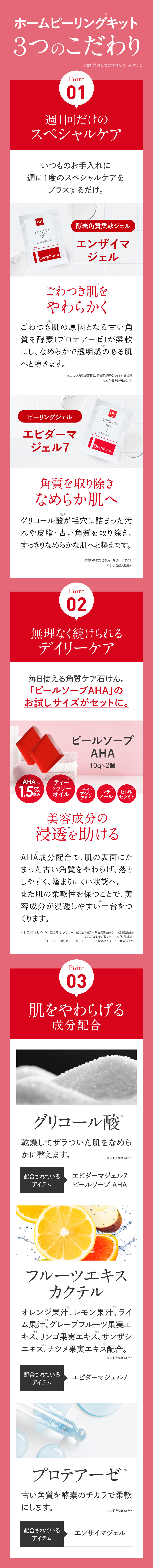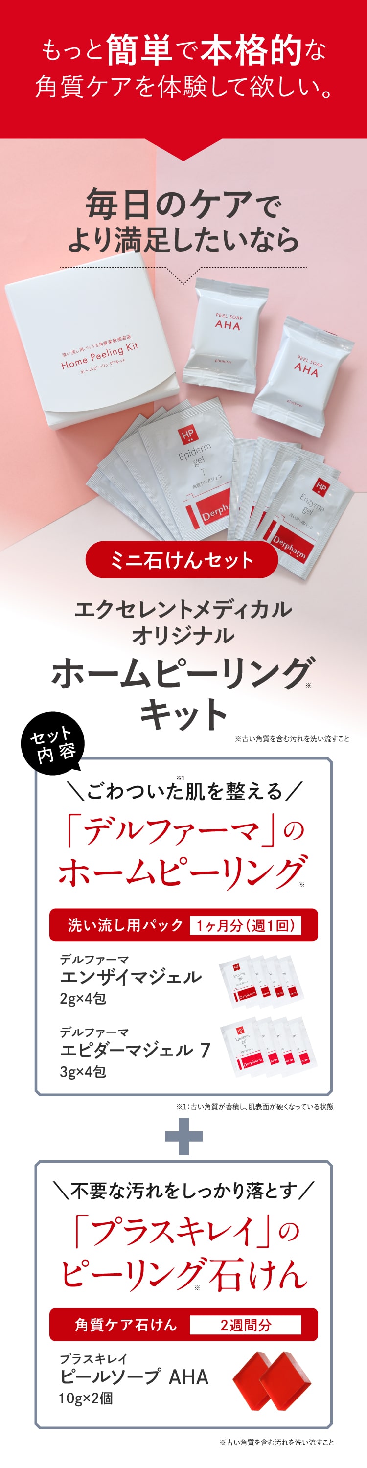 セット内容 | ・エンザイマジェル(酵素ジェル) 2g×4包 ・エピダーマジェル7(角質クリアジェル) 3g×4包 ・プラスキレイ ピールソープAHA(洗顔石けん)10g×2個 ●配合成分につきましては、上記の商品名をクリックしてご確認ください。 |