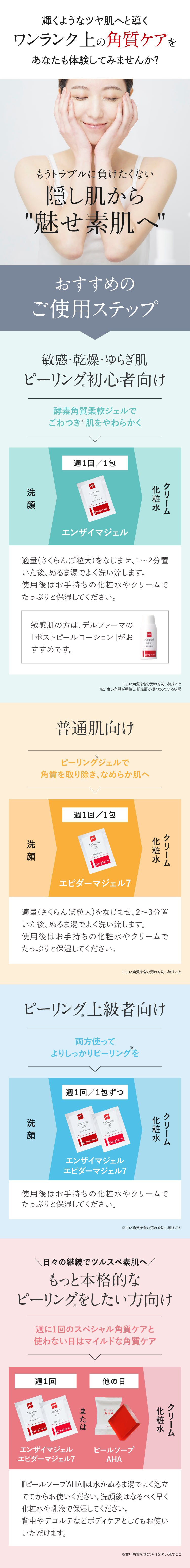 使用方法 | エンザイマジェル 洗顔後水気をふき取り、適量(さくらんぼ粒大)をなじませます。 1〜2分放置してよく洗い流します。洗い流しにくい場合には乾いたティッシュペーパーなどでやさしくふき取りを行ってから、ぬるま湯で洗い流してください。 エビダーマジェル7 洗顔後(またはエンザイマジェル使用後)水気をふき取り、適量(さくらんぼ粒大)をなじませます。2〜3分放置してよく洗い流します。 製品の性質上、使用時にピリピリ感を伴う場合がありますが、通常は洗い流すことで消失、または1〜2時間ほどで治まります。ご利用後は、化粧水やクリームで保湿し肌を整えてください。 ピールソープAHA 週1回のエンザイマジェル、エピダーマジェルでピーリングを行わない日に毎日のケアとしてお使いください。水かぬるま湯でよく泡立ててからお使いください。洗顔後はなるべく早く化粧水や乳液で保湿してください。 |