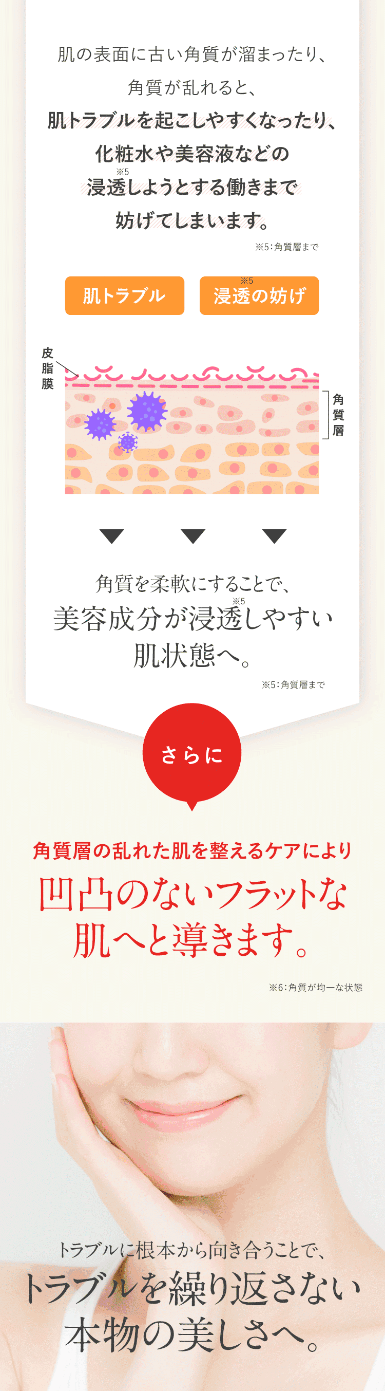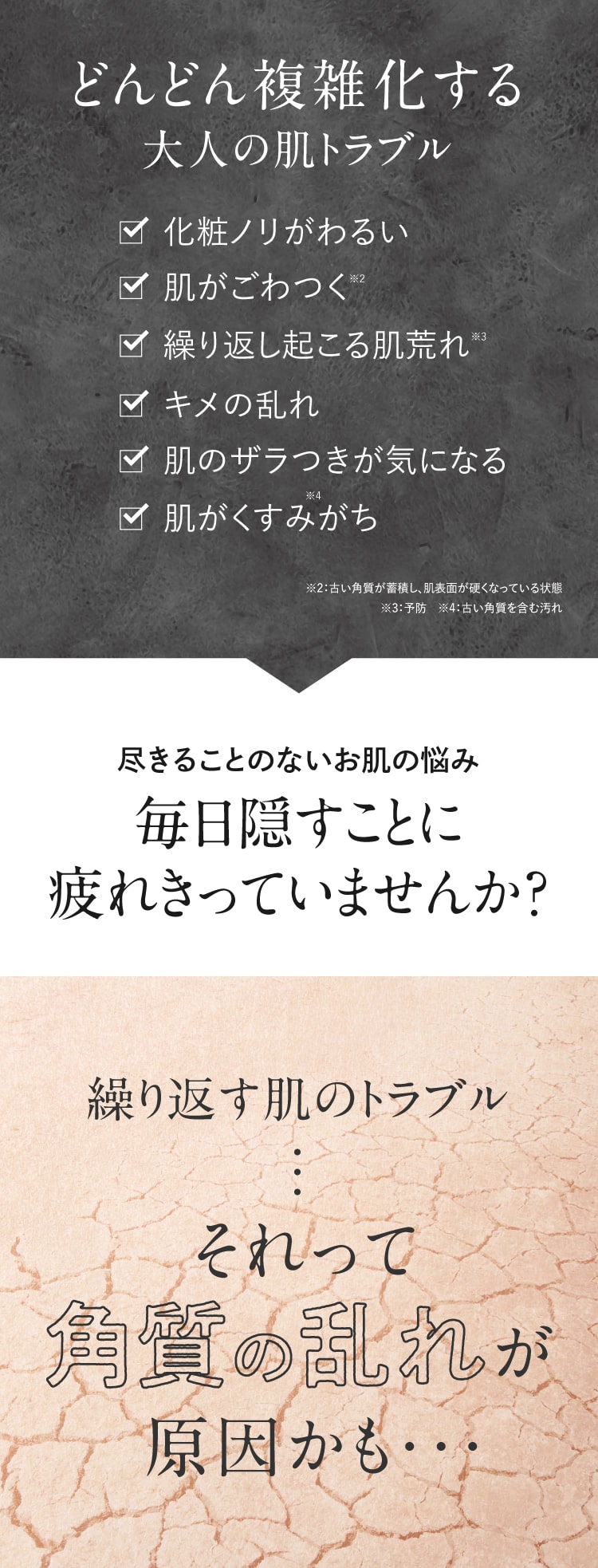 特徴 | 洗い流し用パック(約1ヶ月分)&角質ケア石けん(約1週間分×2個)のセットです。本ページのピーリングとは、古い角質を含む汚れを洗い流す事をさしております。 繰り返し起こる肌トラブルに。角質層の乱れた肌を整えるケアにより凹凸のないフラット(※1)な肌へと導きます。 ※美容クリニック等で行うケミカルピーリング等ではありません。 ※1 角質が均一な状態 |