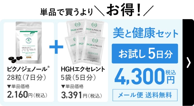 | 商品名 | ピクノジェノール~エクセレントプラス~とHGHエクセレント 美と健康セット【1ヶ月分】 |