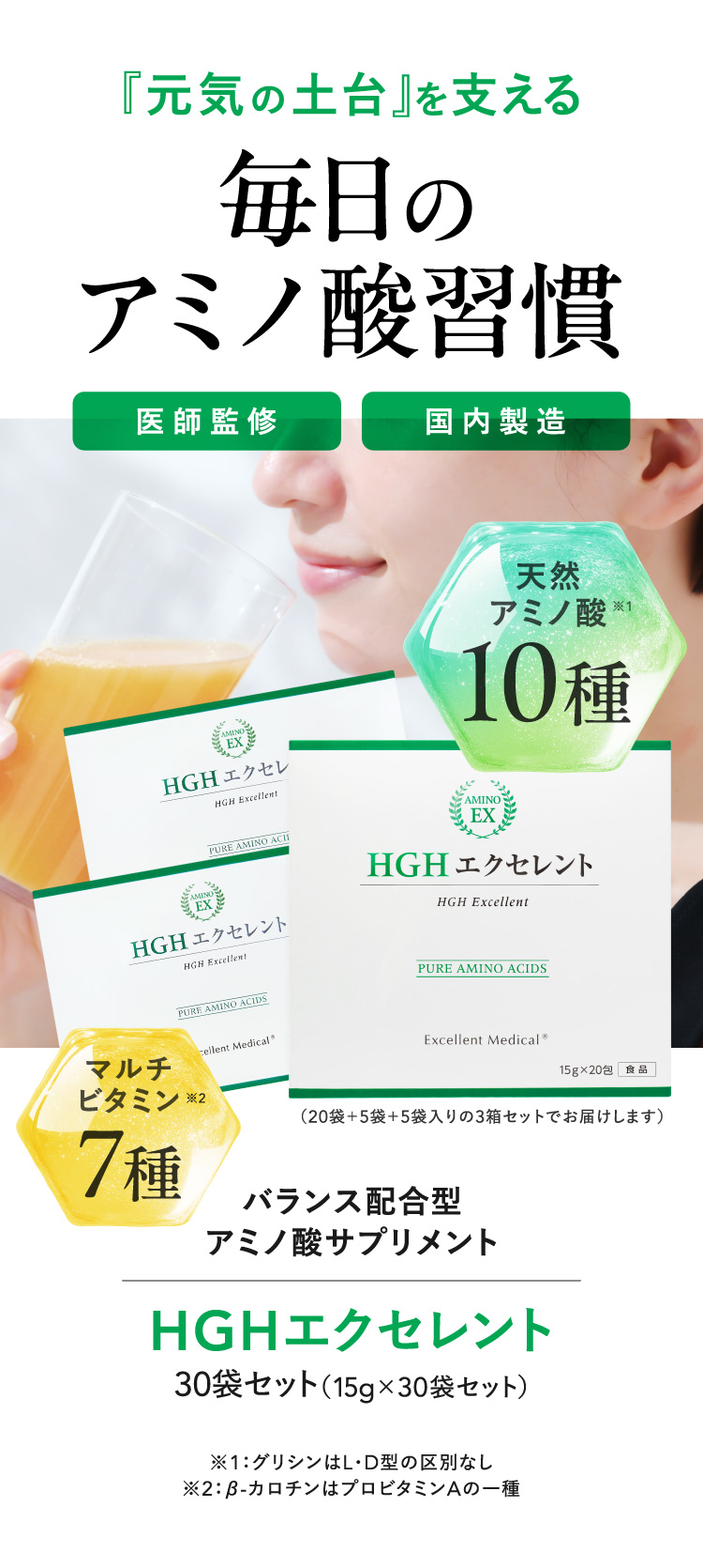 | 特徴 | ▼MDポーサイン100 高純度(*1)のJBPプラセンタエキス末「豚プラセンタエキス純末200mg(*2)」「馬プラセンタエキス純末150mg(*2)」を配合。 プラセンタの大手メーカー、株式会社日本生物製剤の技術協力のもと、“ラエンネック製法”の抽出技術を、国産プラセンタ(豚・馬)に応用。 純粋(*1)で質の高い(*3)プラセンタエキス末(豚・馬)のみがギュッと閉じ込められています。 「MDポーサイン100」は、日本国内で厳重に健康管理されてきた“豚と馬のプラセンタ”を採用しました。 医師監修のもと、研究を重ね独自のバランスで配合されています。 日本生物製剤製のJBPプラセンタエキスを基準以上含有し、厳しい品質基準に適合した製品のみに表示が許諾されている「JBPマーク」が付いた信頼のサプリメントです。 【 プラセンタとは 】 プラセンタは、胎児の発育に必要不可欠な組織「胎盤」のことです。 プラセンタには、たんぱく質・ビタミン・脂質・糖質・ミネラル・アミノ酸・酵素などの栄養素と各種成分が豊富に含まれており、美容と健康をサポートする力があります。 豚プラセンタの特徴 … ヒト由来のものと構造が似ているとされています。 馬プラセンタの特徴 … 栄養価が高く、豊富な栄養成分の中でもアミノ酸が非常に多く含まれていると言われています。 (*1)メーカー商品において (*2)1粒あたり (*3)日本生物製剤の品質基準において ▼HGHエクセレント 10種類の天然『L』型-アミノ酸(*1)をバランスよく配合した、粉末タイプのアミノ酸サプリメントです。 [ グリシン(*1)、アルギニン、リジン、グルタミン、オルニチン、フェニルアラニン、トリプトファン、シトルリン、アラニン、プロリン ] 配合。 「アミノ酸」は元気な体を保つために必要不可欠な栄養素です。 私たち人間の体は、約60~70%が水分でできていますが、その水分を除いた約3分の1がたんぱく質でできています。 筋肉や臓器、髪の毛など体のあらゆる部位にたんぱく質は存在しています。 そのたんぱく質を構成しているのが20種類の「アミノ酸」です。 たんぱく質は20種類の「アミノ酸」の組み合わせでできています。 健康な体を維持するためには、「アミノ酸(たんぱく質)」を補給し続けることが重要です。 アミノ酸の役割は種類によって異なります。 なので、アミノ酸1種類だけをたくさん摂るよりもバランスよく摂ることが何よりも重要です。 HGHエクセレントは、10種類の天然『L』型-アミノ酸(*1)をバランスよく配合しています。 アミノ酸の含有量は1杯(1袋15gあたり)で、なんと11,850mg(*2)! さらに美容と健康に関わる注目の成分「レスベラトロール」も配合。 レスベラトロールはブドウの果皮、新芽などに含まれるポリフェノールの一種です。 ポリフェノールは、紫外線や害虫などの外部ストレスから自らを守るために生物自身が作り出す、まもりの成分です。 「美味しく」「飲みやすく」「続けやすい」を求めて、オレンジ風味に仕上げました。 美容と健康を維持するためには続けることが大切です。 信頼の医師監修、安心の国内製造。 バランス配合型アミノ酸サプリメント『HGHエクセレント』で、これから先も元気で健康的な毎日を。 (*1)グリシンはL・D型の区別なし (*2)たんぱく質換算値 ※腎不全、肝硬変、妊婦、その他医師や栄養士にたんぱく質の食事制限を受けている方は、飲用をお控えください。 ※吸湿しやすいので開封後は、なるべく早くお召し上がり下さい。また乳幼児の手の届かない場所に保管してください。 |
